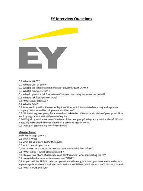 • Prepare Questions to Ask: Asking insightful questions at the end of the interview shows your interest and helps you learn more about the company and the role. Prepare a few questions in advance, such as questions about the company culture, the team, and the career development opportunities. Asking well-thought-out questions shows that you’re engaged and eager to learn. This is your chance to find out more about what it’s really like to work at EY.