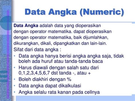 Data numerik isn’t just a random collection of numbers, you know. It’s carefully structured information that represents measurable quantities. Think about things like your age, your height, the price of a stock, or the number of customers a store has. All of these are examples of data that can be expressed numerically. The cool thing about data numerik is that we can perform mathematical operations on it – we can add it, subtract it, multiply it, divide it, and so on. This ability to manipulate the data is what makes it so powerful for analysis and decision-making. We can use it to calculate averages, identify trends, and make predictions about the future. For example, if we have sales data for a particular product, we can analyze the data to see which months the product sells the most, which marketing campaigns are most effective, or even predict future sales. That’s the beauty of working with numbers; they’re precise and give us the tools to understand the world around us. There are two primary subcategories of data numerik : discrete and continuous . Discrete data represents values that can only take on specific, separate values (like the number of children in a family - you can’t have 2.5 children, right?). Continuous data, on the other hand, can take on any value within a range (like your height, which can be 5’ 6.5”, or even more precise). Understanding the difference between these types of data is crucial for choosing the right analytical techniques.