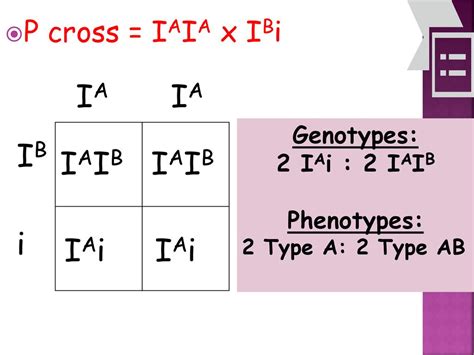 Time for the fun part: predicting the possible blood types of their children! To do this, we’ll use a handy tool called a Punnett Square . This simple diagram helps us visualize the different allele combinations that their offspring can inherit. On one side of the square, we’ll list the husband’s possible alleles ( IA and IB ), and on the other side, we’ll list the wife’s possible alleles ( IA and i ). Then, we’ll fill in the squares by combining the alleles from each parent.