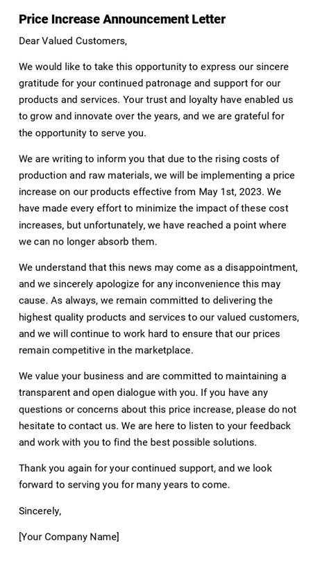Finally, let’s consider Example 3: A Service Provider . This provider sent an email with the subject line “Notification: Upcoming Price Changes.” The email began with a polite greeting and clearly stated that prices for their services would be increasing. The company provided a detailed explanation for the price increase, citing rising operational costs and investments in training. They also highlighted the improved quality of service customers would receive as a result. The email included a clear breakdown of the old and new prices, as well as the effective date. The company expressed gratitude for their customers’ continued support and provided multiple channels for contacting customer service. What made this example effective? The detailed explanation and emphasis on improved service quality were strong points. The clear breakdown of prices and multiple contact channels made it easy for customers to understand the changes and get their questions answered. The polite greeting and expression of gratitude created a positive tone. By analyzing these real-world examples, you can gain valuable insights into how to craft your own effective price increase announcements. Remember to be transparent, clear, and empathetic, and always highlight the value you provide to your customers.