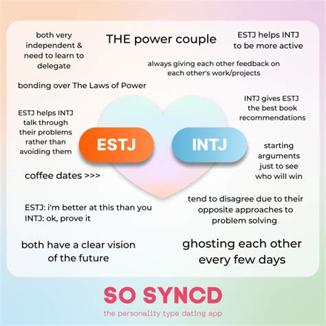 The relationship between an ESTJ and INTJ is a fascinating blend of structure and strategy. While their differences may present challenges, their shared values and complementary strengths can create a powerful and fulfilling partnership . By understanding each other’s personalities, communicating openly, and respecting their unique perspectives, ESTJs and INTJs can build a strong, lasting bond. So, if you’re an ESTJ or INTJ in a relationship with one another, remember to embrace your differences, celebrate your similarities, and work together to create a relationship that is both challenging and rewarding. With a little effort and understanding, you can build a partnership that thrives on mutual respect, intellectual stimulation, and unwavering support.