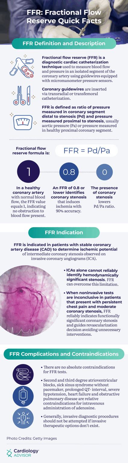 Let’s get into the nitty-gritty of how FFR is measured . It’s a procedure that happens during a standard cardiac catheterization, also known as a coronary angiogram. So, if you’re already undergoing that diagnostic test, measuring FFR is a relatively straightforward add-on. First off, the patient is typically sedated, and a local anesthetic is applied to the insertion site, usually in the groin or wrist, where a small catheter is introduced into an artery. This catheter is then guided up to the heart using X-ray imaging. Once the cardiologist has accessed the coronary arteries, they’ll inject a contrast dye to visualize them on the angiogram. Now, here’s where the FFR part comes in. A special pressure wire – which is a very thin, flexible wire with a tiny pressure sensor at its tip – is advanced through the catheter and into the coronary artery that has a significant-looking blockage. This pressure wire measures pressure both before and after the blockage. To get a true measure of how much the blockage is affecting flow, the artery needs to be maximally dilated. This is achieved by administering a hyperemic agent , most commonly adenosine, which is infused either intravenously or directly into the coronary artery. Adenosine causes the small blood vessels within the heart muscle to widen significantly, increasing blood flow to its maximum capacity. While the artery is maximally dilated and blood flow is at its peak, the pressure sensor on the wire records the pressure distal to the stenosis (downstream of the blockage) and compares it to the pressure recorded proximal to the stenosis (upstream, usually measured by the catheter itself, which reflects aortic pressure). The FFR value is then calculated as the ratio of the distal pressure to the proximal pressure. So, if the distal pressure is, say, 0.75 times the proximal pressure, the FFR is 0.75. A normal, healthy artery would have an FFR close to 1.0, meaning there’s virtually no pressure drop. As we discussed, an FFR value below 0.80 is generally considered hemodynamically significant, indicating that the blockage is substantially impeding blood flow and likely warrants intervention. Values above 0.80 suggest the blockage is not causing significant flow limitation. The entire process, including the FFR measurement, typically adds only about 10-15 minutes to the overall cardiac catheterization procedure. It’s a relatively quick and safe addition that provides invaluable functional information. The results are usually available immediately, allowing the cardiologist to make a well-informed decision about the next steps right there and then. It’s this precision that makes FFR such a powerful tool in our armamentarium against coronary artery disease.