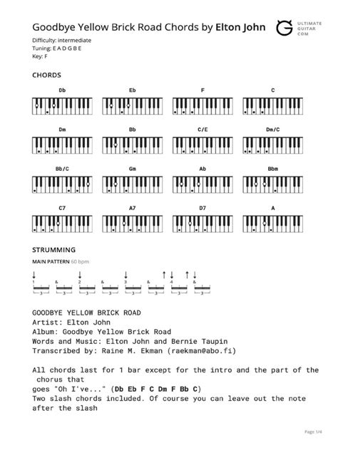 Okay, so you’ve got the chords down – awesome! But how do you actually play them to sound like the record? Strumming is key, guys. For “Goodbye Yellow Brick Road,” the strumming pattern is generally quite straightforward but has a certain rhythmic feel that’s crucial. In the verses, a simple down-down-up-up-down-up pattern often works wonders. This pattern provides a steady, driving rhythm without being overly complex. It allows the melody and lyrics to shine through while still giving the song a solid harmonic foundation. Think of it as a gentle pulse, like a heartbeat carrying the narrative forward. It’s not too aggressive, allowing for that slightly wistful, reflective tone of the verses. For the chorus, you might want to open up the strumming a bit. A slightly more energetic down-down-up-down-down-up or even a fuller down-down-up-UP-down-up pattern can capture that anthemic feel. The emphasis shifts here; you want to hit those chords with a bit more conviction to match the swelling emotion. The key is to listen closely to the original recording. Pay attention to when the strumming gets louder or softer, and how the rhythm changes slightly between sections. Elton’s piano playing often dictates a very specific feel, and translating that to guitar requires listening and adapting. Don’t be afraid to experiment! Sometimes, a simple down-down-down-down pattern can work for certain sections, especially if you want to emphasize a particular chord or create a more sparse feel. Another variation that adds a lot of character is incorporating palm muting during the verses. This is where you lightly rest the side of your picking hand on the strings near the bridge, creating a duller, percussive sound. It gives the strumming a tighter, more controlled feel, which really suits the introspective mood of the verses. Then, when you hit the chorus, you can release the palm mute and let the chords ring out more fully, creating that dynamic contrast. For piano players, the challenge is different but equally rewarding. Elton’s piano part is intricate and often involves arpeggiated figures and rhythmic chord voicings. Try to capture the rhythmic drive of the chords, even if you simplify the embellishments. Focus on playing the root notes strongly and then adding the other chord tones in a rhythmic fashion. Using the sustain pedal effectively can also help mimic the ringing quality of guitar chords. The goal isn’t always to replicate every single note but to capture the essence and feel of the original. So, practice these patterns, listen intently, and don’t be afraid to put your own spin on it. The best way to learn is by doing, so keep strumming!