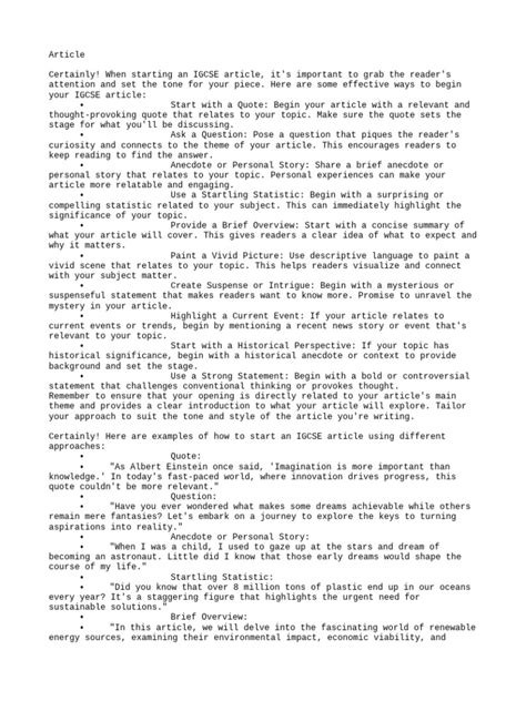 Now, let’s talk structure, guys. A well-structured article is like a house with a solid foundation – it won’t crumble under pressure, and it looks good too! For your IGCSE article, you’ll want to follow a clear and logical flow. The introduction is your hook. It needs to grab the reader’s attention immediately and let them know what the article is all about. Think of a catchy title, a compelling question, a surprising statistic, or a relatable anecdote. You want to make them think, “Ooh, I need to read this!” This is also where you can briefly outline the main points you’ll be covering. Next up are the body paragraphs . Each paragraph should focus on a single idea or point that supports your main topic. Start each body paragraph with a clear topic sentence that introduces the point. Then, elaborate on that point with examples, explanations, evidence, or personal experiences. Remember to use transition words and phrases (like ‘furthermore,’ ‘however,’ ‘in addition,’ ‘consequently’) to ensure your paragraphs flow smoothly from one to the next. This is crucial for readability and coherence. Think of it like connecting the dots for your reader. Finally, the conclusion is your wrap-up. It should summarize the main points you’ve discussed and leave the reader with a lasting impression. You might offer a final thought, a call to action, or a prediction for the future. Avoid introducing new information in your conclusion; it should feel like a natural end to the discussion. A strong conclusion reinforces your message and leaves your reader satisfied. So, remember: Catchy Intro -> Well-Developed Body Paragraphs -> Strong Conclusion . Nail this structure, and you’re already halfway there!