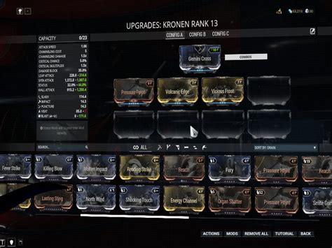 As mentioned earlier, mods and upgrades can significantly enhance the Kronen’s performance. Experiment with different mod combinations to find the setup that best suits your playstyle. Essential mods often include those that boost damage, critical chance, critical damage, and attack speed. Status chance mods can also be very effective, allowing you to inflict debilitating effects on your enemies.