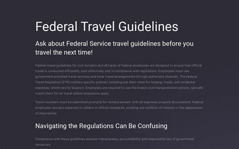 Alright, let’s get down to business. What exactly are federal travel regulations ? At their heart, they are the comprehensive set of rules and guidelines established by the U.S. government to govern how federal employees and contractors can spend taxpayer money when traveling for official government business. These regulations are designed with a few key goals in mind: cost control , accountability , and ensuring that travel is absolutely necessary and efficient . They cover pretty much every aspect of a government trip, from planning and booking to expenses and reporting. Think about it – when you travel for work, you want to know you’re doing it right, right? These regulations provide that framework. They dictate things like what modes of transportation are permissible (and when you can splurge on a slightly faster option, wink wink), the per diem rates for lodging and meals in different locations, and what constitutes a reimbursable expense. It’s all about making sure public funds are used responsibly and effectively. These rules aren’t just arbitrary; they’re built on principles of economy and good stewardship of government resources. You’ll often hear about specific government agencies and documents that are central to these regulations. The General Services Administration (GSA) plays a huge role, as they set many of the per diem rates and provide guidance on travel policies. Another key player is the Federal Travel Regulation (FTR) itself, which is the primary document outlining the rules. We’ll be diving deeper into these as we go. Understanding the why behind these rules is just as important as knowing the what . It fosters a culture of transparency and fiscal responsibility across all federal agencies, ensuring that every dollar spent on travel serves a genuine government purpose. So, when we talk about federal travel regulations, we’re talking about a structured system aimed at responsible and effective travel for the nation’s business.