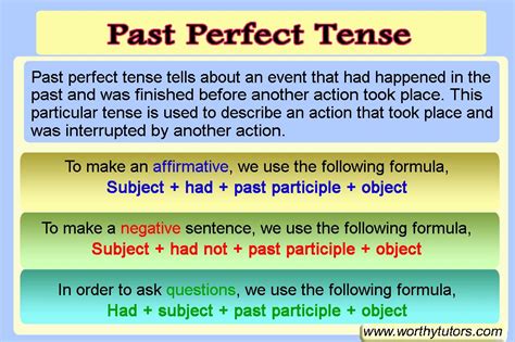The past perfect tense is formed using “had” + the past participle of the verb. The past participle is usually the same as the simple past form for regular verbs (ending in “-ed”), but irregular verbs have their own unique past participle forms. For example, “eat” becomes “had eaten,” “go” becomes “had gone,” and “see” becomes “had seen.” Mastering the past perfect tense involves knowing how to form the past participle correctly, especially for irregular verbs. Practice forming the past perfect tense with different verbs to get comfortable with its structure. Understanding this tense is crucial for expressing complex relationships between past events.
