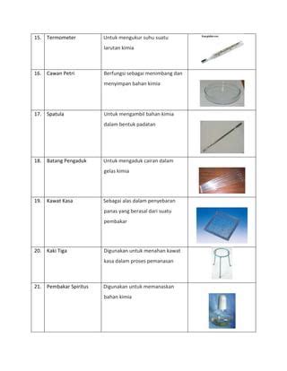 - Spatula: Buat mengambil atau memindahkan bahan kimia padat.