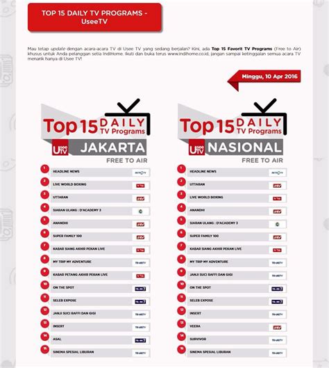 Guys, biar nggak ketinggalan keseruan dan nggak bingung mau nonton apa, ada beberapa trik nih buat kamu yang mau nemuin program TV Indonesia dengan rating tertinggi yang sesuai sama selera kamu. Pertama, jangan malas buat browsing dan cek tangga rating. Banyak situs berita hiburan atau akun media sosial yang rutin ngeluarin daftar program TV terpopuler tiap minggunya. Ini semacam peta harta karun buat kamu yang mau cari tontonan hits . Perhatikan juga stasiun TV mana yang paling sering menayangkan program-program unggulan. Biasanya, stasiun TV besar punya beberapa program andalan yang memang udah diprediksi bakal laris manis. Kedua, manfaatkan rekomendasi dari teman atau media sosial . Kadang, teman kita punya selera yang sama, atau postingan di media sosial bisa ngasih clue tentang acara apa yang lagi banyak dibicarain orang. Coba deh scroll timeline kamu, siapa tahu ada rekomendasi menarik yang muncul. Kalau ada teman yang bilang “Nonton ini deh, seru banget!”, langsung aja dicatet! Ketiga, perhatikan genre favoritmu . Kalau kamu suka banget sama drama percintaan, cari sinetron-sinetron yang lagi naik daun di genre itu. Kalau kamu suka ketawa ngakak, fokus aja cari acara komedi yang lagi on fire . Nggak perlu maksa nonton acara yang nggak kamu suka cuma karena lagi rating tinggi, nanti malah nggak menikmati. Keempat, jangan ragu untuk mencoba episode pertama . Banyak program TV yang awalnya mungkin kelihatan biasa aja, tapi episode-episode selanjutnya justru makin seru. Jadi, kasih kesempatan dulu di awal. Kalau dalam satu atau dua episode kamu merasa nggak nyambung, ya nggak apa-apa, langsung ganti aja. Tapi kalau nyantol, wah, siap-siap nemu tontonan favorit baru! Kelima, cek juga ulasan atau *review *. Kadang, ada kritikus atau penonton lain yang ngasih ulasan tentang sebuah program. Ini bisa jadi pertimbangan tambahan buat kamu. Tapi ingat, selera orang beda-beda, jadi ulasan itu cuma sebagai referensi aja ya. Keenam, pertimbangkan jam tayang . Program dengan rating tertinggi seringkali tayang di jam-jam strategis, kayak prime time malam hari. Kalau kamu punya waktu luang di jam-jam tersebut, coba deh pantengin stasiun TV yang lagi banyak ngeluarin program bagus. Terakhir, yang paling penting, nikmati prosesnya ! Mencari tontonan yang pas itu juga bagian dari me time lho. Jadi, santai aja dan jangan terlalu overthink . Dengan beberapa tips ini, kamu pasti bisa nemuin program TV Indonesia rating tertinggi yang bikin hari-harimu makin berwarna. Selamat berburu tontonan seru, guys!
