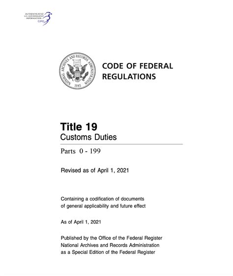 Now, let’s get a bit more specific about Title 19 CFR 2023 , the revised edition as of April 1, 2023. While I can’t go through every single section – this thing is huge – we can highlight some of the major areas it covers. You’ll find detailed information on Customs Duties and Import Requirements . This is where you learn about tariff classifications (the Harmonized Tariff Schedule, or HTSUS, is a big part of this), valuation of imported goods, and the different types of duties that might apply. It covers things like marking requirements (where the goods are from), country of origin rules, and special trade programs that might offer reduced or free duty rates for certain goods or countries.