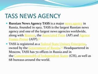 TASS (Telegraph Agency of the Soviet Union, now Russian News Agency TASS)