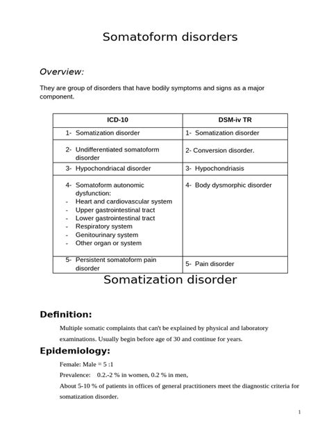 Hey guys, let’s dive into a topic that can be super confusing but is incredibly important: somatoform disorders , and how they’re classified using the ICD-10 system. We’re talking about those perplexing conditions where a person experiences real physical symptoms that don’t seem to have a clear medical cause. It’s not about faking it; it’s about the mind and body connection playing some seriously tricky games. Understanding these disorders is crucial for both those experiencing them and the healthcare professionals trying to help. The International Classification of Diseases, Tenth Revision (ICD-10) is our go-to guide for categorizing diseases and health problems, and it gives us a framework to understand and diagnose these complex conditions. It helps ensure that doctors worldwide are on the same page when it comes to identifying and treating somatoform disorders, even though the exact mechanisms are still being explored. The key takeaway here is that these aren’t psychological issues in addition to physical ones; often, the physical symptoms are the primary manifestation of the psychological distress. We’ll be breaking down the main types, the diagnostic criteria, and why this classification is so vital for getting the right kind of support. So, buckle up, because we’re about to unpack the world of somatoform disorders and the ICD-10 codes that define them.