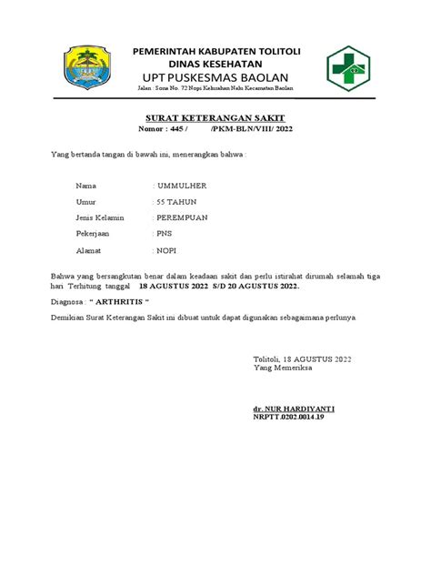 Let’s break down what you’ll typically find on a Nomor Surat Keterangan Sakit . Understanding the components is key to ensuring everything is in order. At the top, you’ll usually see the heading “Surat Keterangan Sakit” or something similar, clearly identifying the document’s purpose. Then, there’s your personal information. This includes your full name, date of birth, and sometimes your address or identification number (like your KTP number). This is how they officially identify you. Next comes the date of examination. This is the date when you visited the doctor and were assessed. Make sure this date is accurate! Following this, the document will mention the diagnosis. This is the medical condition the doctor has identified as causing your illness. The specific diagnosis will help your employer or school understand the nature of your illness. The Nomor Surat Keterangan Sakit then states the period of absence. This is the crucial part: it specifies how long you are excused from work or school. It will usually include a start and end date. Double-check these dates to ensure they align with the time you need to recover. The doctor’s details are also included. You’ll find the doctor’s name, their license number, and their contact information. This is important for verification purposes. The doctor’s signature and stamp are the final, most crucial elements. The signature confirms that the doctor has examined you, and the stamp is the official seal. Without these, the certificate is invalid. Some certificates may also have space for additional information. This might include recommendations for follow-up care or any other relevant details. It’s important to review the certificate thoroughly to ensure all details are accurate and that the dates are correct. If something is missing or incorrect, it’s best to clarify with the doctor before submitting it. Make sure you understand each element and that the certificate accurately reflects your medical condition and the period you need to be off work or school. Understanding the contents of your Nomor Surat Keterangan Sakit will help you to use it effectively and to avoid any misunderstandings with your employer or school.