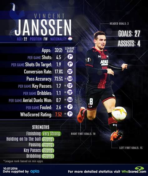 When we look at Vincent Janssen’s statistics holistically, a few things stand out. His goal-scoring record in the Eredivisie (especially his Golden Boot season) and his consistent output in Liga MX are clear indicators of his predatory instincts and finishing ability. He possesses a strong physical presence, making him effective in aerial duels and as a target man. His pass completion and assist statistics, while not his primary strengths, show he’s capable of linking up play, though his main value has always been his ability to find the back of the net . The dip in his statistics during his time at Tottenham highlights a potential weakness in adapting to higher defensive pressure and a more physically demanding league. His conversion rate at Spurs was a key statistic that underscored his struggles. However, his subsequent success in Mexico suggests that with the right system and support, he can be a prolific scorer. Statistical analysis often reveals that strikers thrive in environments where they receive consistent service and operate within a system that plays to their strengths. Janssen’s career trajectory demonstrates this perfectly. His ability to score consistently in the Eredivisie and Liga MX, compared to his struggles in the Premier League, points towards the importance of tactical fit and league dynamics. He’s a player whose raw goal numbers tell a significant part of his story, but understanding the context of those numbers is key to a full appreciation of his career. The performance metrics provide a fascinating look into his capabilities, showing a striker with clear strengths in goal scoring when placed in the right setting. It’s a valuable lesson for both players and clubs about finding that perfect match. His goal-scoring statistics are his calling card, and when those numbers are high, he’s a force to be reckoned with.