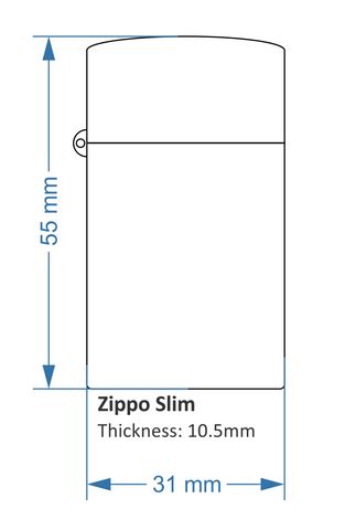 • Zippo Slim Lighter: Generally, it is around 2.4 inches (6.1 cm) tall, 1.25 inches (3.2 cm) wide, and 0.38 inches (1.0 cm) thick.